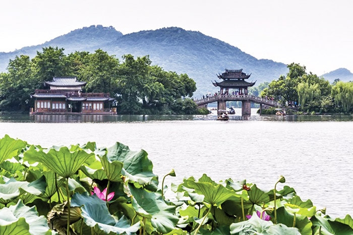 - Tây Hồ- Viên ngọc quý của thành phố Hàng Châu mệnh danh Tứ Đại Danh Hồ nơi Lương Sơn Bá gặp Chúc Anh Đài, Bạch Xà hội ngộ Hứa Tiên trong truyền thuyết. Trên đường di chuyển vào Tây Hồ, đoàn tản bộ để cảm nhận hết được vẻ đẹp cổ kính pha lẫn một vài nét hiện đại bởi các cửa hàng đặc sản Trung Hoa: Đoạn Tâm Kiều - Trường Kiều: dạo bước tại 2 cây cầu lớn và nổi tiếng nhất nơi đây. Cảm nhận Tứ Đại Dân Gian Truyền Thuyết qua chuyện tình Lương - Chúc, Hứa Tiên - Bạch Nương tại nơi chứng minh tình yêu; Dạo thuyền Hồ Tây: lênh đênh trên sóng nước Hồ Tây như nhà thơ lớn: Bạch Cư Dị - Tô Đông Pha đã từng làm; Ngắm nhìn Tam Đàn Ấn Nguyệt - Công trình bằng đá để đo thủy triều lên xuống cổ xưa ở đây và Tháp Lôi Phong cao và cổ nhất xứ Hàng Châu.